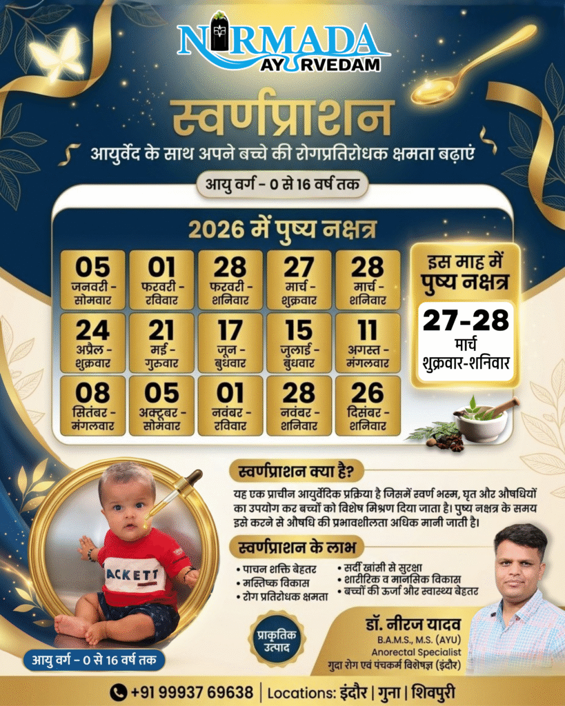 Swarnaprashan is an ancient Ayurvedic ritual where a special herbal preparation with gold is given to children to enhance immunity, improve brain development, and strengthen overall health. It is best performed on the sacred Pushya Nakshatra days.