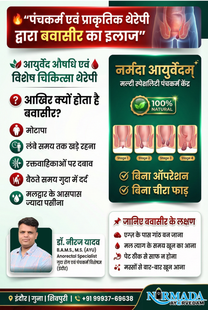 I’m Dr. Neeraj Yadav, Anorectal Specialist at Narmada Ayurvedam (Indore, Guna, Shivpuri). With years of clinical experience, I help patients recover from anorectal disorders such as piles, fissure, and fistula using pure Ayurvedic treatments and Panchakarma therapy.